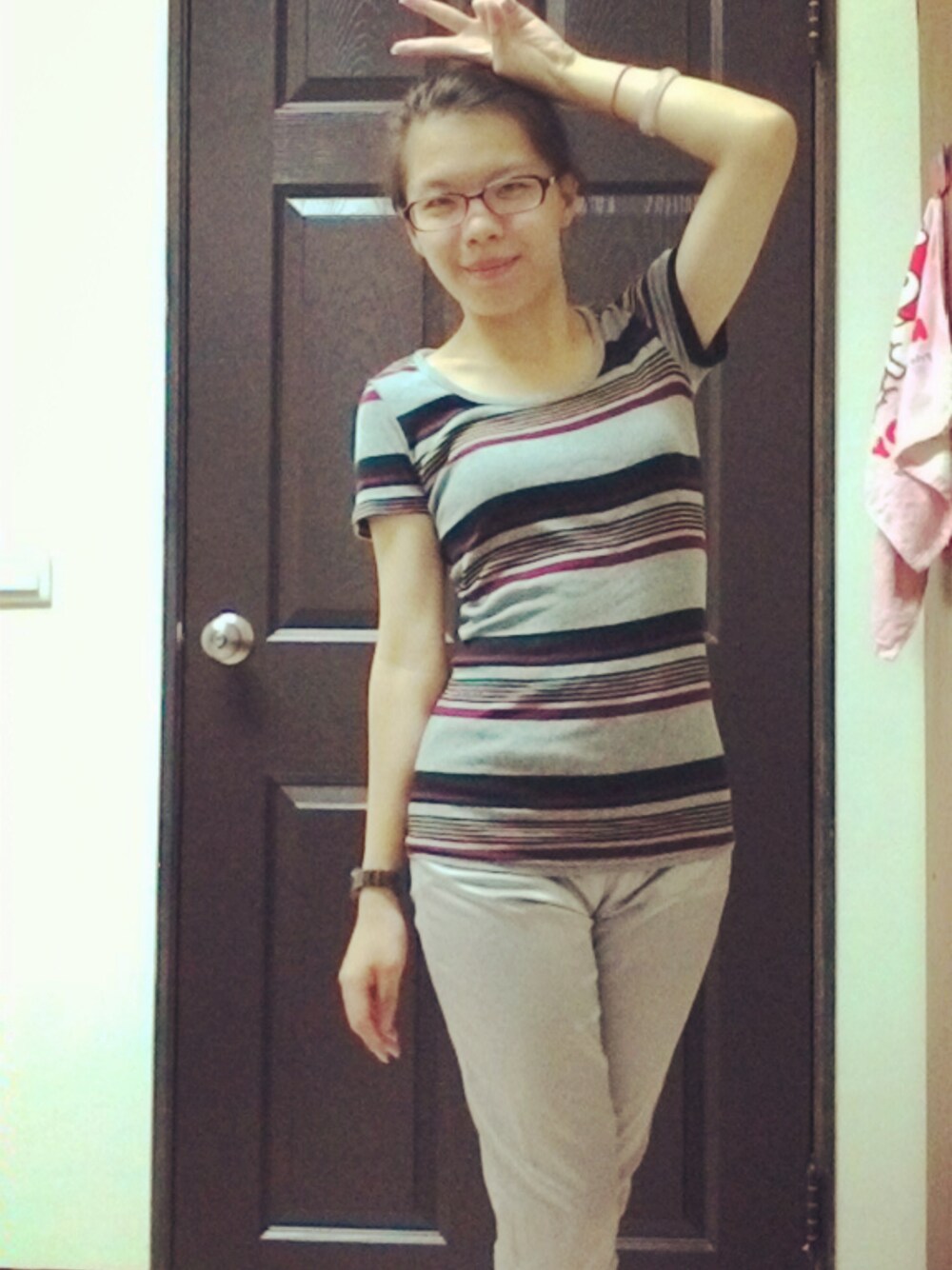 簡單條紋風搭配窄管銀色緊身褲 顯現出活潑樣。