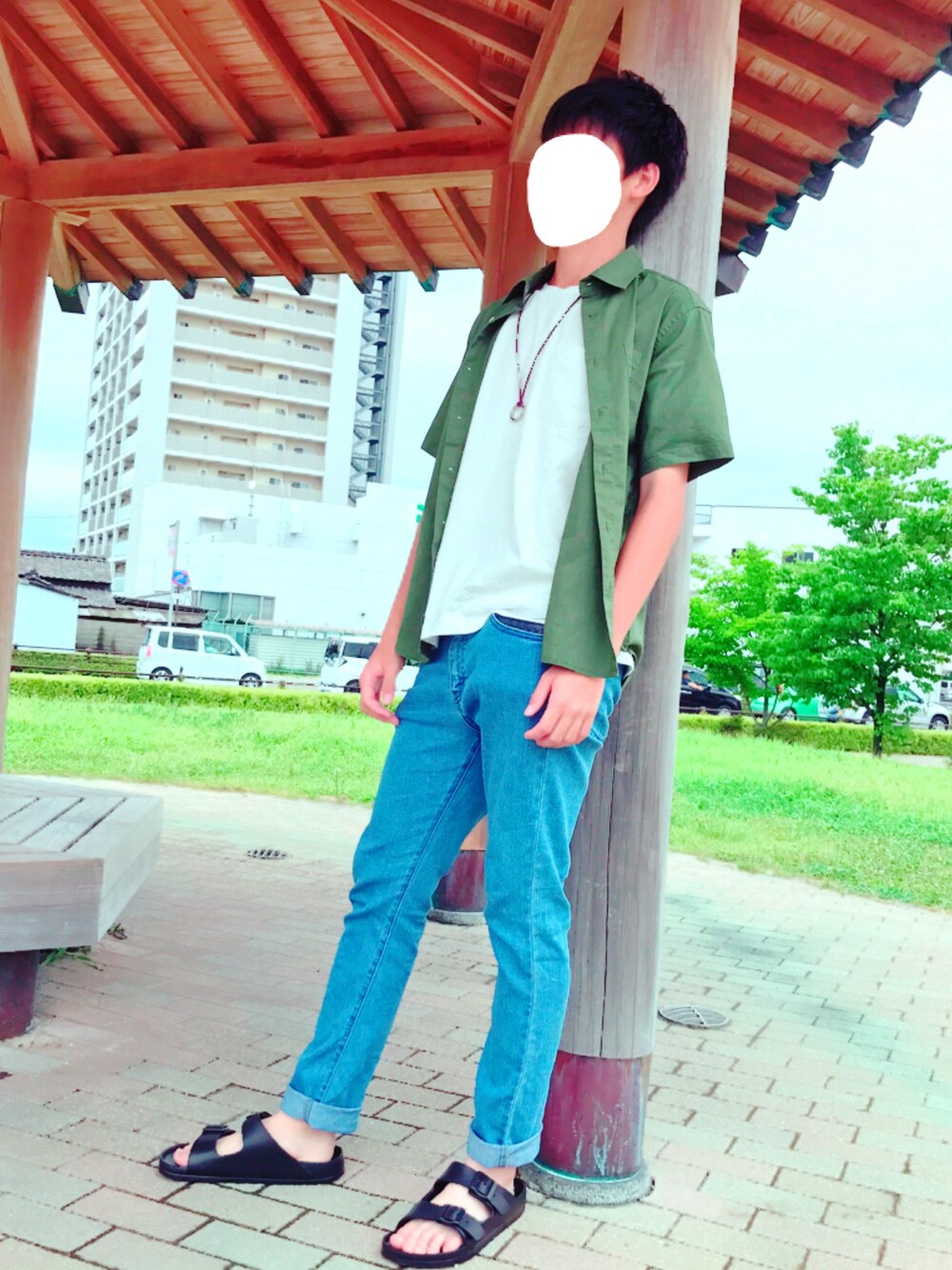 フレンチリネンのカーキシャツに白色のポケットTシャツを合わせて爽やかなシンプルコーデにしてみました👐 ズボンもロールアップして夏らしさをイメージしてみました👐