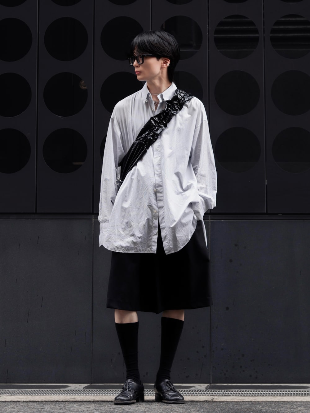 ▶︎ インスタのフォローもよろしくお願いいたします!! 【 ID : @___quu___ 】 モードな印象に仕上げた夏のショーツスタイル♟️ 少し光沢感のあるシャツとショルダーバッグに、膝下丈のショーツを合わせてゆるさとモード感のバランスを意識してみました◎ レザーシューズと長めのソックスで足元を引き締めつつ、小物は全体のトーンに合わせてブラックで統一。 シンプルだけど立体感のあるシルエットがお気に入り。