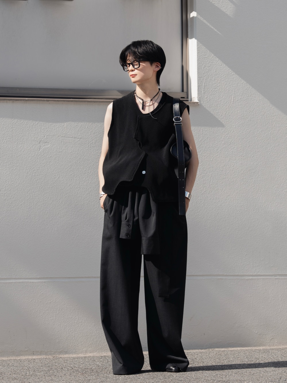 ▶︎ インスタのフォローもお待ちしております!! 【 ID : @___quu___ 】 日中はまだ暑さが残る秋の立ち上がり時期にぴったりな、プリーツベストとジャンプスーツを主役にしたスタイリング💻 ボトムスはチャコールグレーのジャンプスーツを腰巻きし、レイヤード感と動きのあるシルエットをプラスしています♟️ シンプルなブラックベースに、腰元のチャコールグレーがアクセントとなり、モードでありながらも程よい抜け感を演出。 プリーツの立体感が、ワントーンに奥行きを与えてくれるのもポイントです。 腰巻きしているジャンプスーツは、9/3に @lapiis_official からリリースされる新作。 秋のワードローブにぜひ加えていただきたいアイテムです🍂