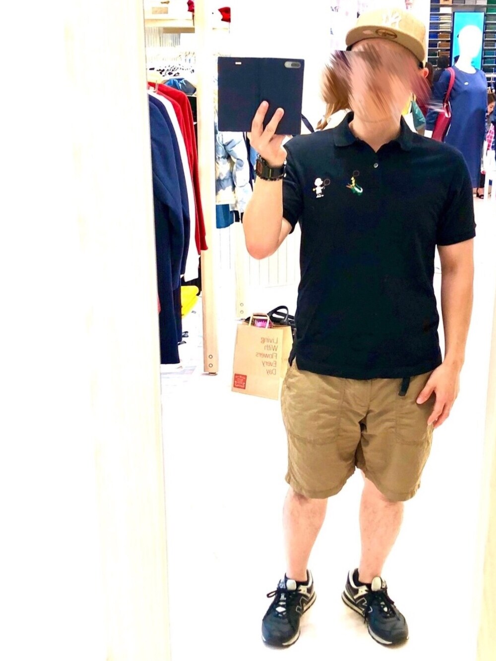 「秋色スポーティー」 2年前くらいのラコステ×ピーナッツコラボのポロシャツをメインに黒×ライトベージュで秋の雰囲気を出した。 ポロシャツは黒でも清潔感が出るのがありがたい(^^) ピーナッツコラボはホンマに着ない。でもラコステの仲の良い店長が異動になるので、特別な気持ちで着ていった。素直に寂しい😭
