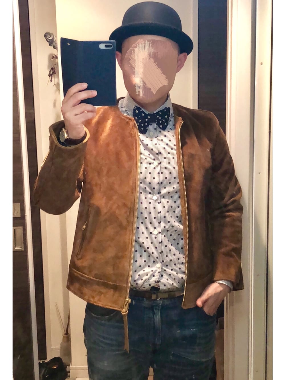 「Wild & Dressy」 常連のお店が10周年だったので、レザージャケットとリペアデニムでワイルド感を出しつつ、蝶ネクタイをつけてドレス感を出した。 街で浮くかな、と思ってたけど案外大丈夫。 これからさりげなく蝶ネクタイをつけていこう!