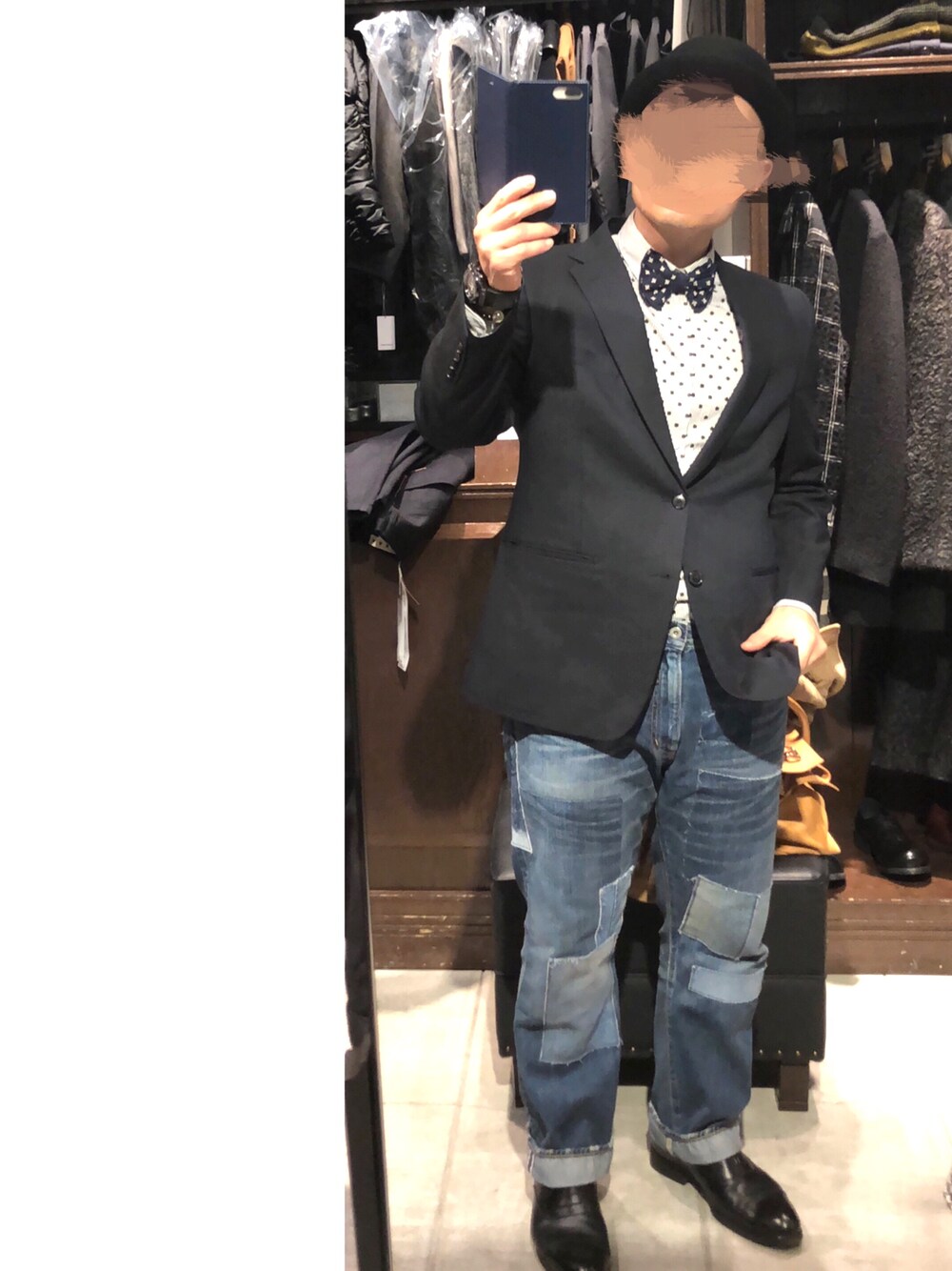 「常連のお店の周年お祝いコーデ」 常連の周年祭に合わせた、ドレッシーだけど気取りすぎないコーデ。蝶ネクタイとジャケットにあえてのリペアデニム。 力の抜けた小粋な大人を気取ってみた笑