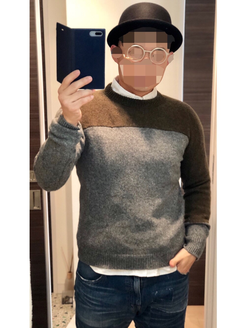 「もはやマスクマン笑」 masahiromaruyamaの眼鏡を主役に。 デザインが個性的過ぎて正直持て余してたけど、ようやく落ち着くコーデが見つかった ロベルトコリーナのニットが上品に合ってくれて一安心。 モザイクをかけていくうちにマスクマンみたいになってしまった笑