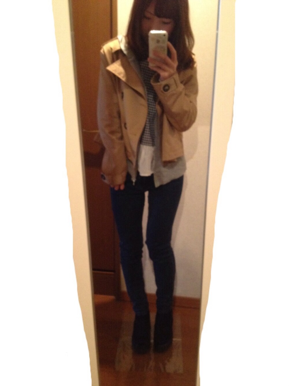 トレンチコート:ブランド不明 パーカー:gu デニム:UNIQLO