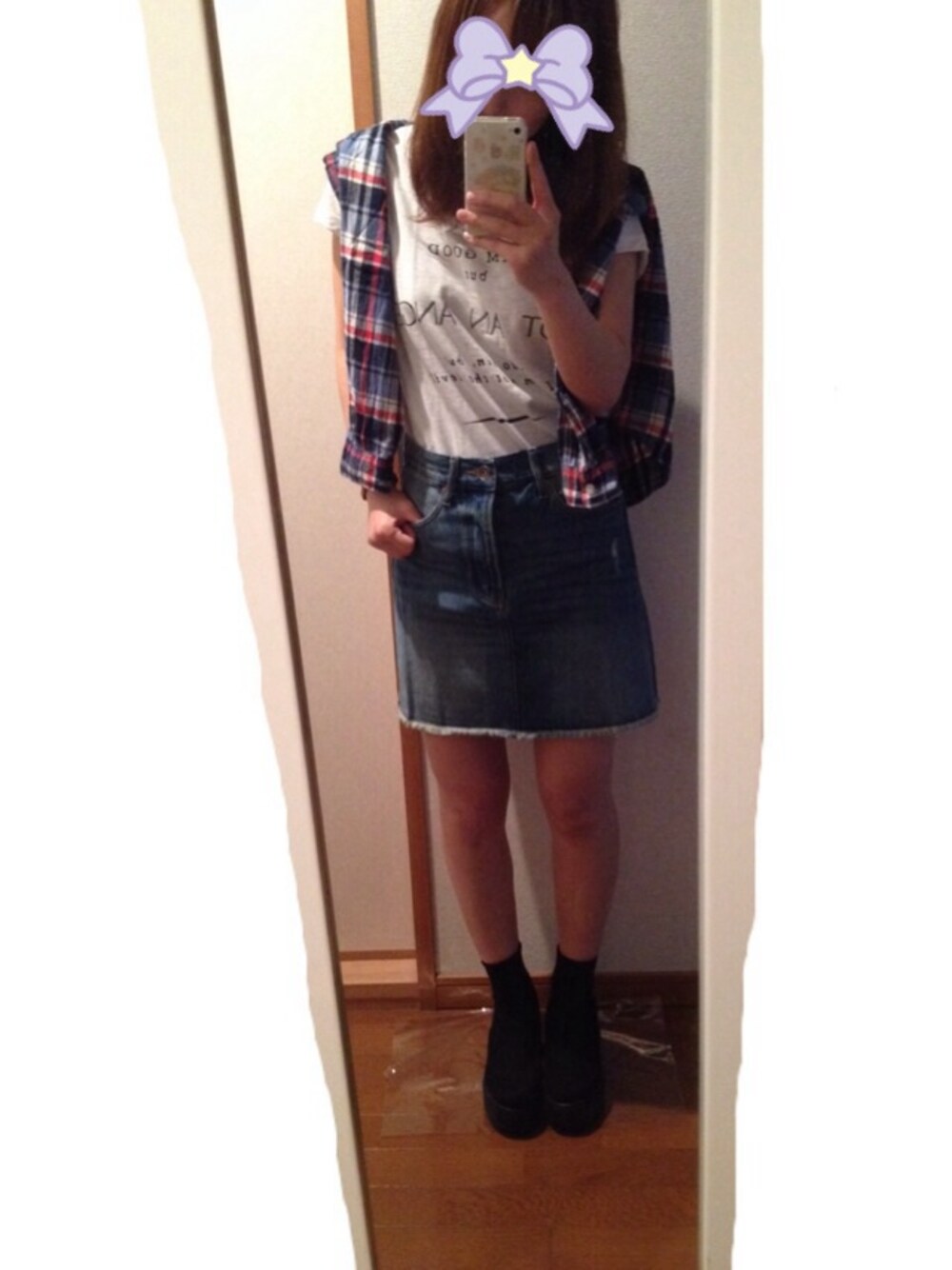 Tシャツ:GU チェックシャツ:UNIQLO kids スカート:GU 激安コーデ☺︎