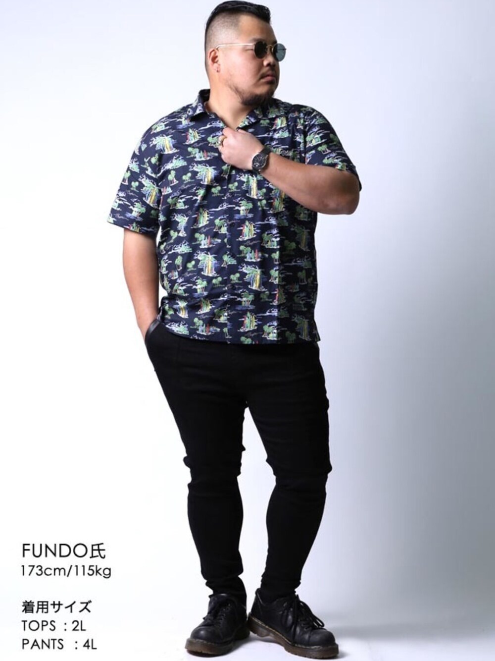 黒と紺の引き締め柄コーデが令和 スリムなブラックスキニーパンツに大きいサイズのメンズに絶対的に合う柄シャツで、どこか南国チックなサマースタイルの完成だ。 サーフ系の柄がよりデカイ男を魅力的にバージョンアップ。これはもう令和だ。 なぁ?そうおもうだろ?