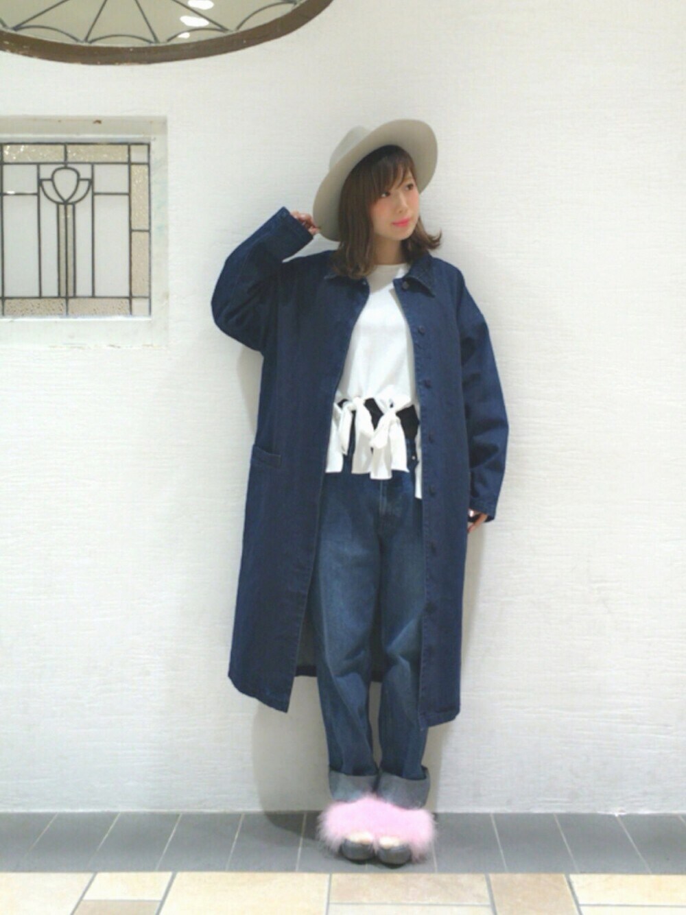 デニムオンデニムはロングジャケットなら挑戦しやすくて◎ インナーのフリンジリボンカットソーはゆるっとしてて着やすくてシンプル可愛くて素晴らしいです👏🏻💓 ウールHATはグレーをGET🎈 最近はグレーやブルーが好き〜💕