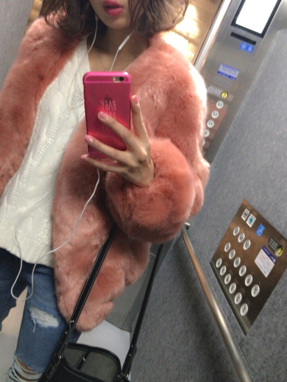 ピンクのファーコート買ってしまった😗💕 久々にクラッシュデニム履いた👖 最近はカジュアルな服が好き〜💋