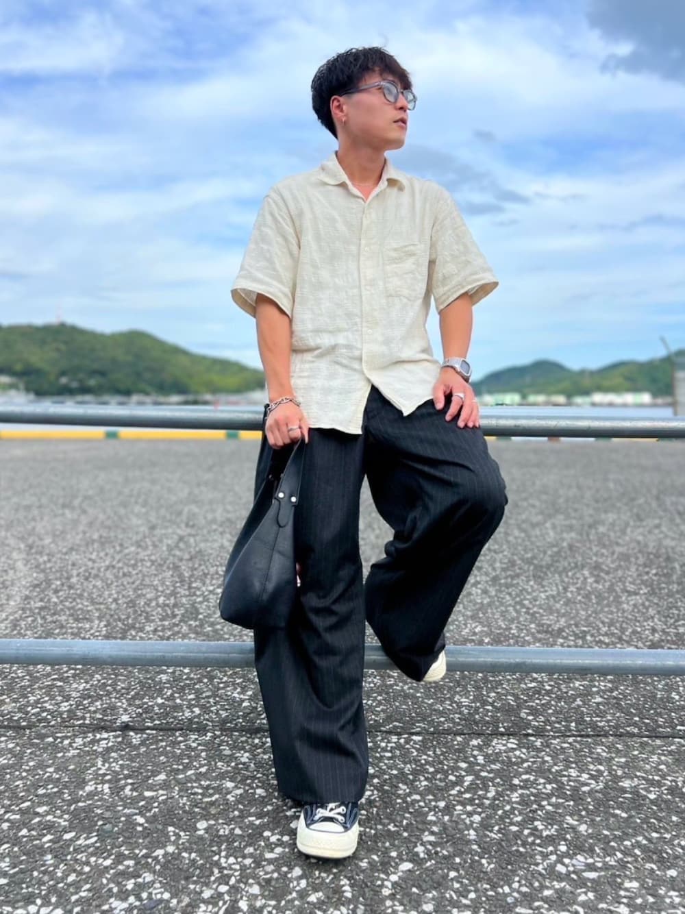 秋の休日に、リラックス感と大人っぽさを両立したい方におすすめ。 WYMの新作ストライプバギースラックスを主役に、 ベージュシャツで軽やかな印象に。 足元はスニーカーで抜け感を出しつつ、 小物で上品さをプラスしました。