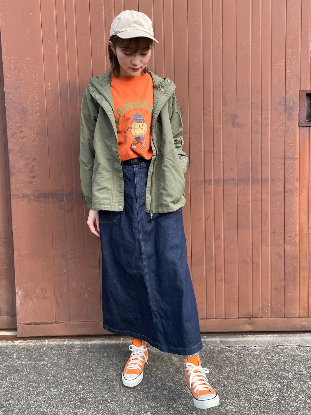 パキッとしたオレンジにカーキの組み合わせおすすめです🧡 ジャケットは撥水で雨の日もガシガシ使えちゃう季節の変わり目にぴったり!