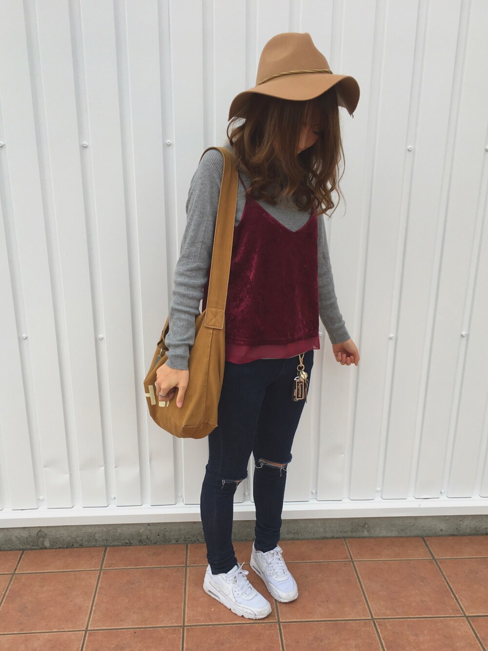 いつかのcode😌🍒 ROSEBUDのベロアキャミは リバーシブルで着れるよ〜👌💓 EMODAのスキニーも、めっちゃ ストレッチ効いてて履きやすい⤴️😎🤘 MHL.のかばんは使いやすいし お気に入り💕