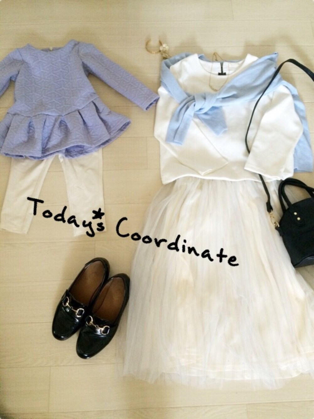 パステル×ホワイトでリンクコーデ。 娘はワンピース:楽天、パンツ:UNIQLO