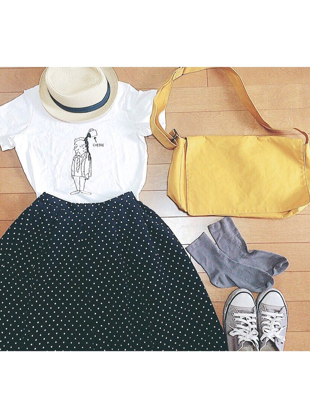 置き画で✩︎⡱ YAECAのTシャツはまだ肌寒い頃に買ったから、いつになったら着れるかな〜〜と思ってうずうずしてたけど、やっと着れる!嬉しい〜〜! コーヒーおじさん癒される( ˘͈ ᵕ ˘͈ )♩