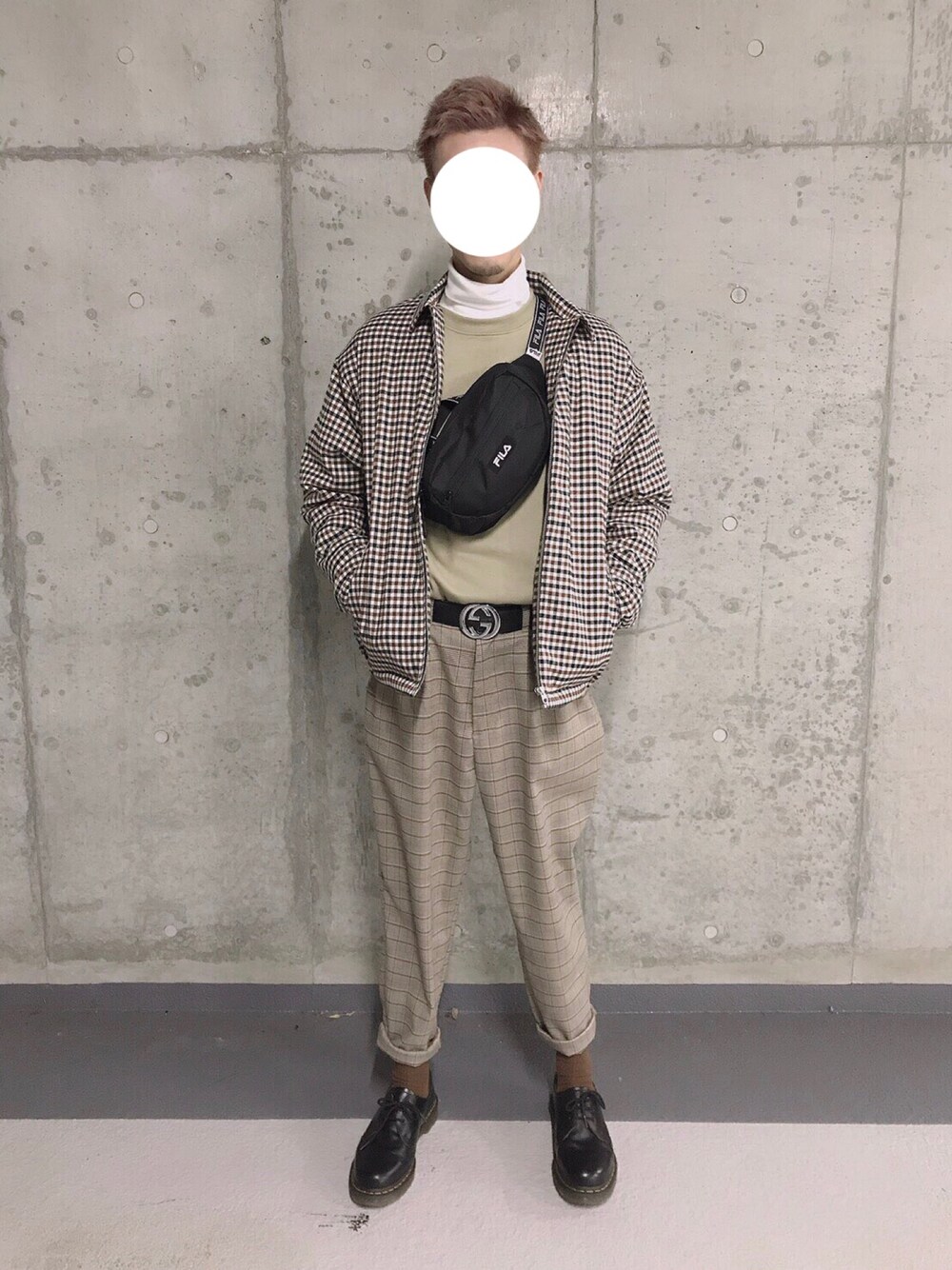 ベージュ、ブラウン、ブラックのチェックコーデ👕👖 FILAのウエストバックはヴィレッジヴァンガードさんで売ってました。! 限定的な? 一歩間違えたらおじいちゃんみたい👴