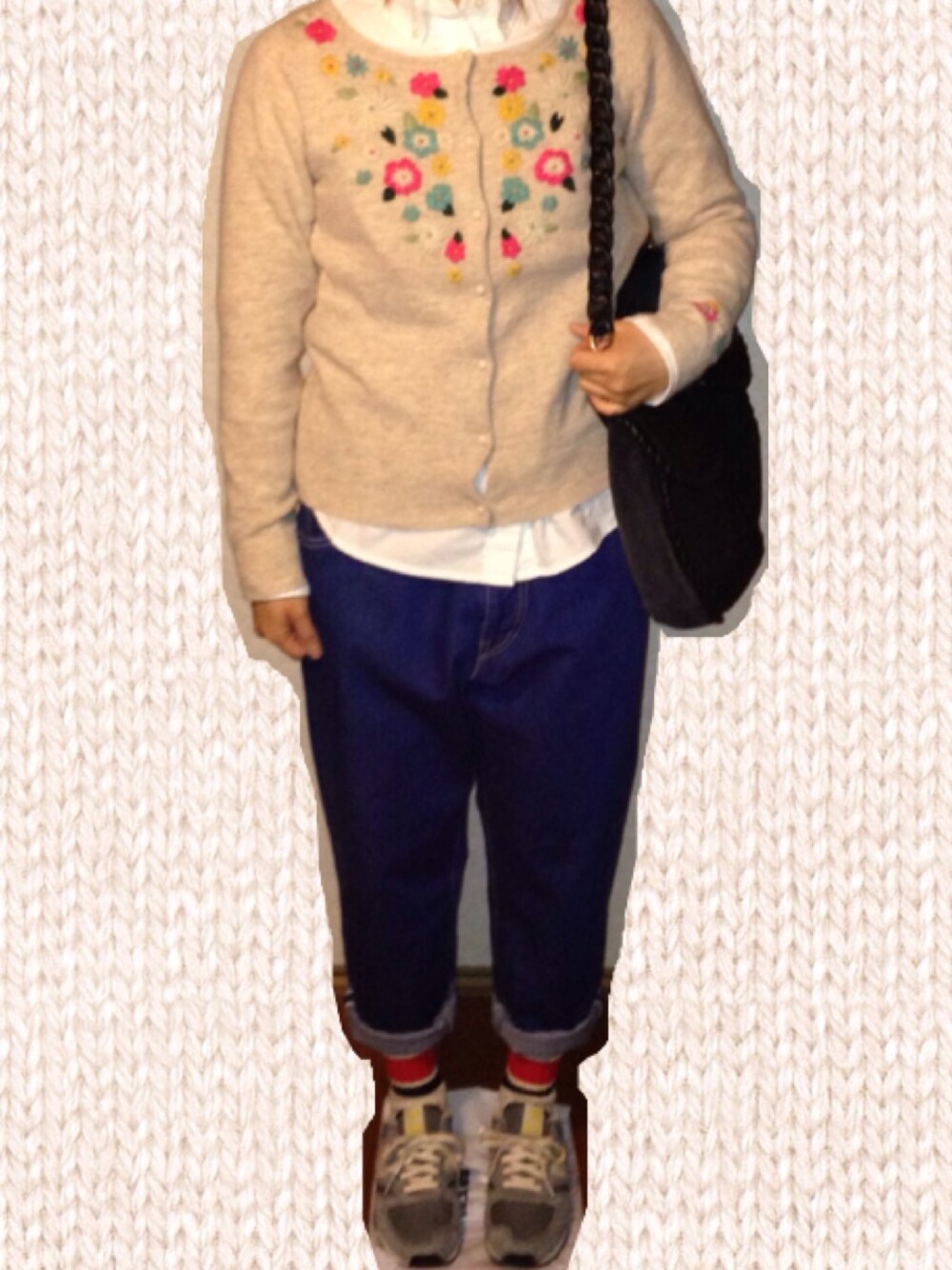 刺繍大好き♥︎ シャツ‥UNIQLO カーディガン‥CHILD WOMAN デニムパンツ‥ironari 靴‥new balance 靴下‥靴下屋
