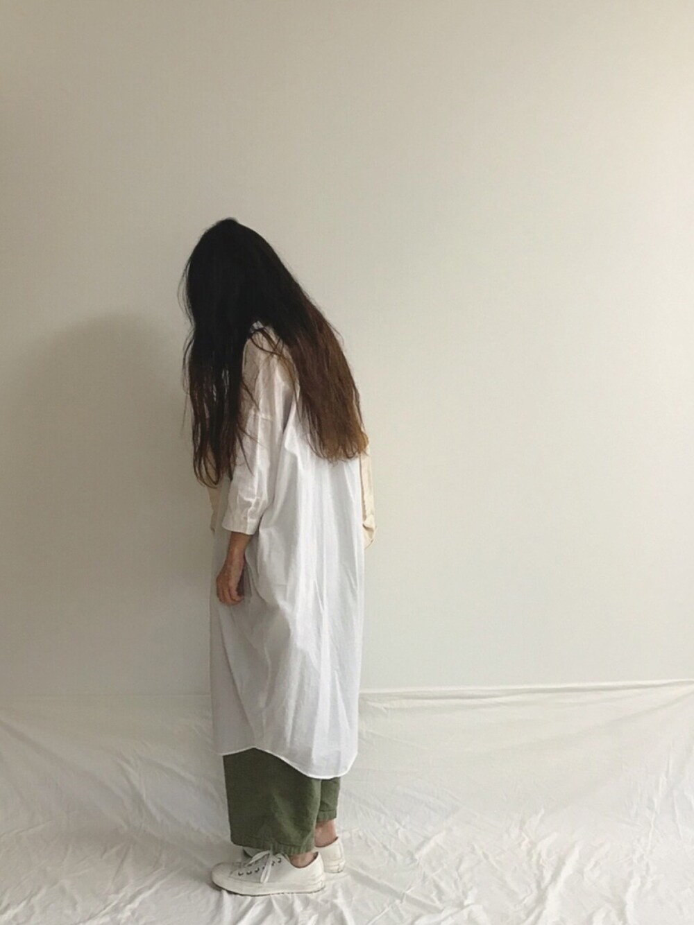 Rabbitsekine🐰のシャツワンピース「コットンダンガリーダブルポケットロングワンピース」を使ったコーディネート