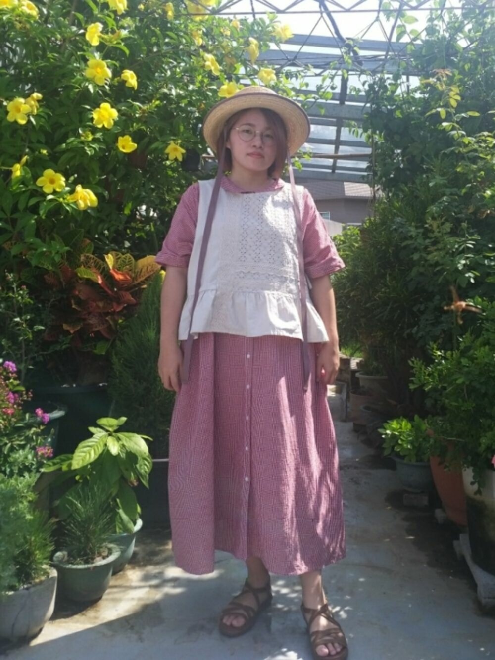Red x Beige Good Morning🌻 早晨的陽光穿過花叢 灑落在可愛的洋裝上 非常田園風的穿搭