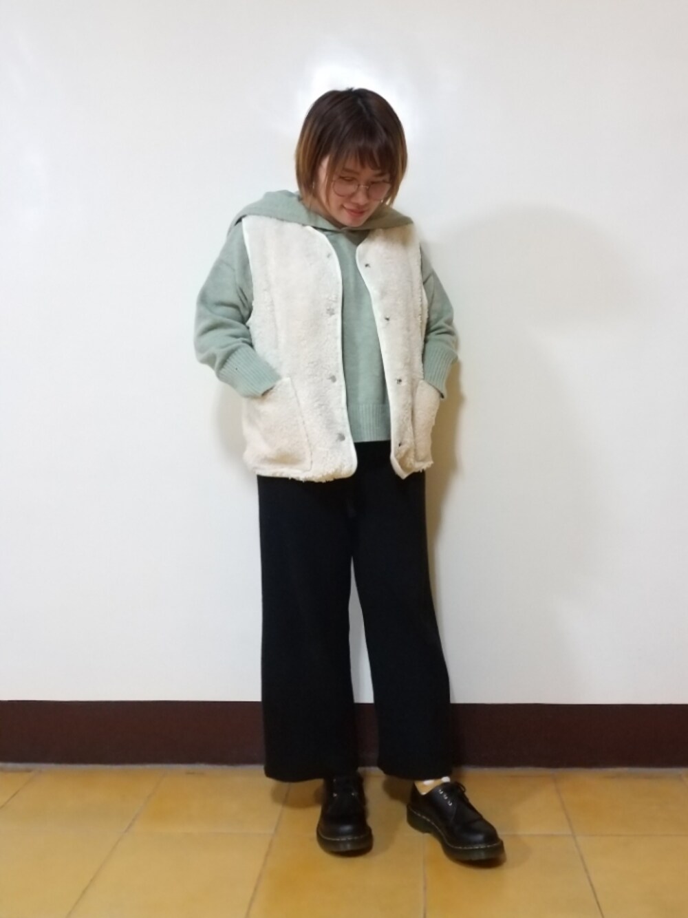 Green x Ivory 【Point】Yellow 濕冷氣溫12°C、體感溫度8°C 真的好冷 搭配羊毛背心溫暖多了