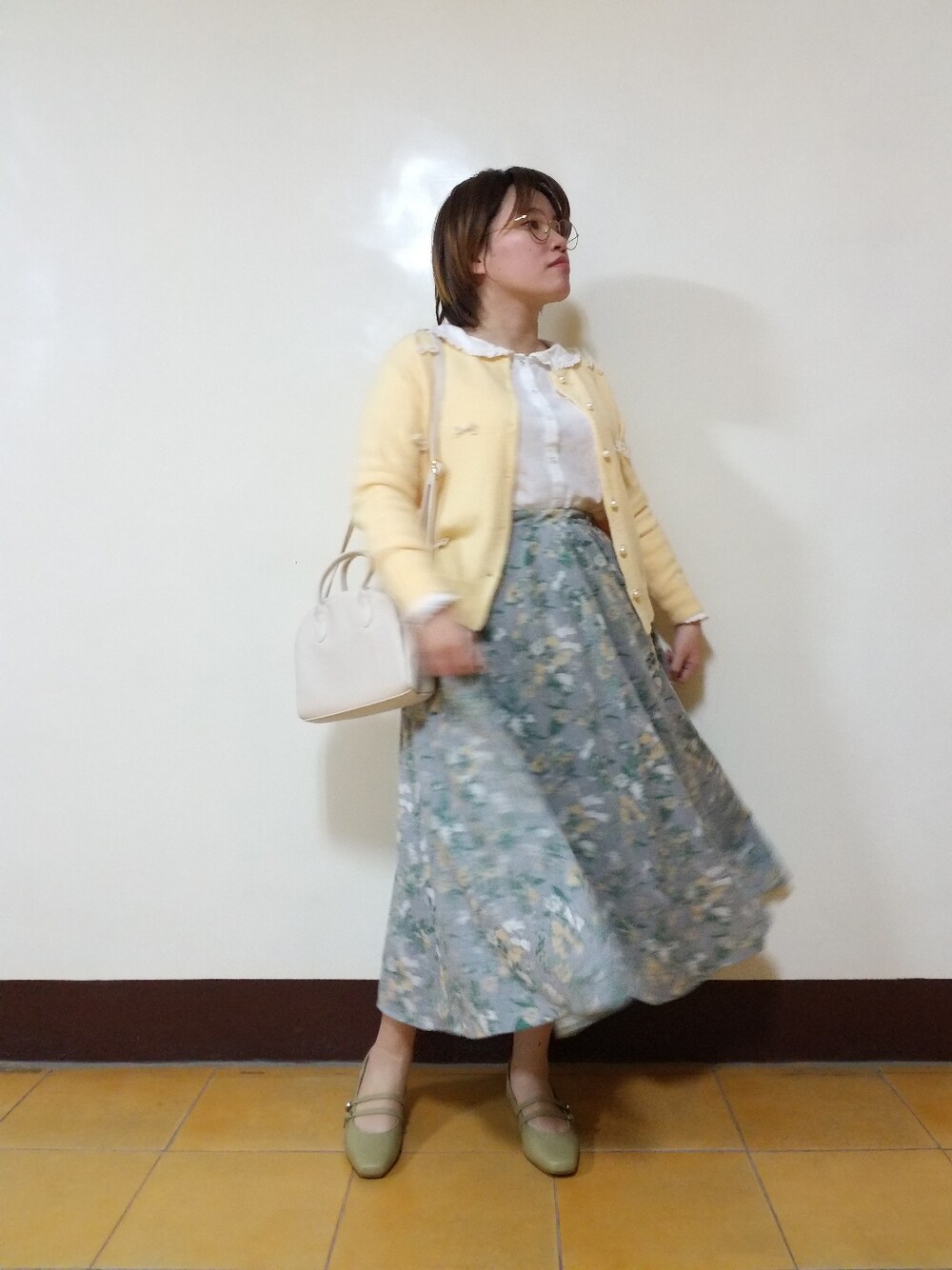 Yellow x Blue 春天粉嫩的配色 超美的棉麻花裙 黃色針織外套跟裙子呼應 再配上草綠色瑪麗珍鞋