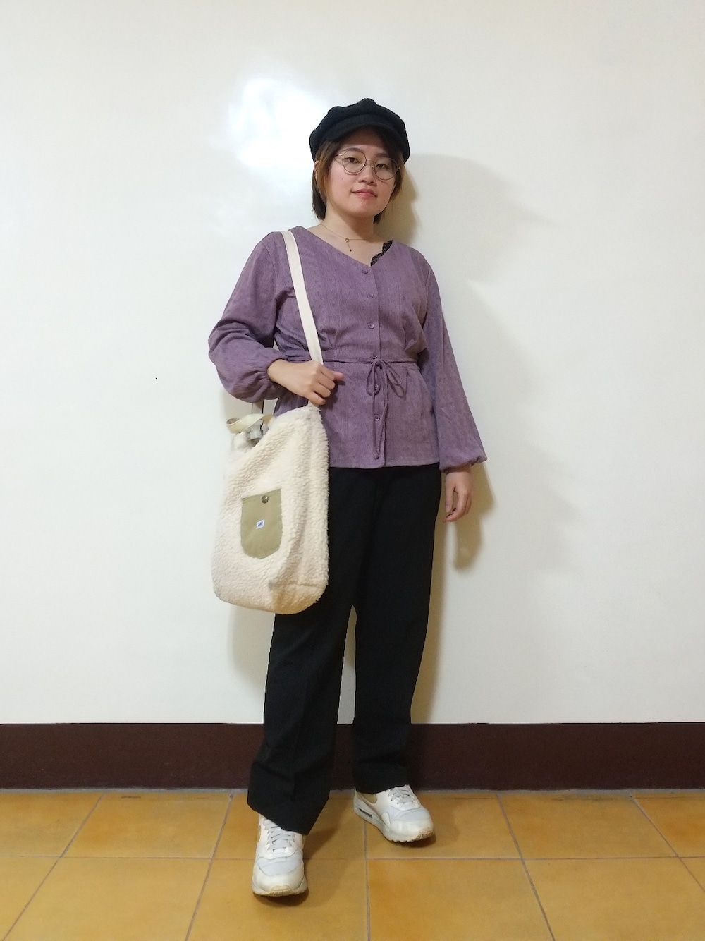 Purple x Black 紫色V領上衣附上綁帶 再搭配黑色蕾絲背心增加層次感 黑色西裝休閒褲 超挺超顯瘦