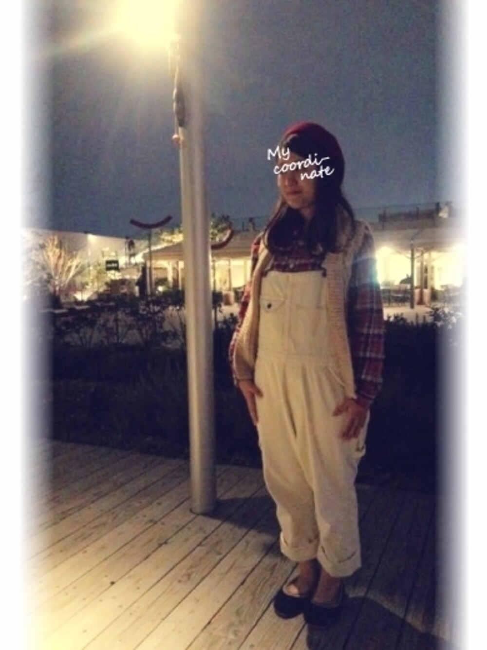 素敵な夜 学校の授業が休みだったので、地元に帰りました。 地元の大学の学祭に行きました。 学祭らしく、カジュアルでお洒落に おめかしして出かけました。 今年初のベレー帽! この色、とても好きです。 D.M.Gのお気に入りの赤のチェックシャツに いつもお世話になってるオーバーオールを 合わせました。 そして、ベージュの手編みのニットベストで 温かくしました。 足元は、足首を出す方が女性らしさが 出るということで、フェルトのペタンコ靴を 合わせました。