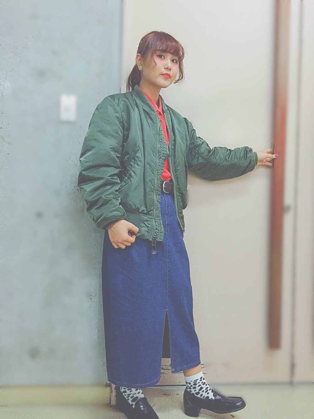 👗 fashion show coordinate 👗 American のショーでは MA-1とLevi'sの赤ポロシャツ+デニム と、お決まりのウエストイン!👖 このデニムスカートお気に入り過ぎて 何回も着まわしてる(笑)