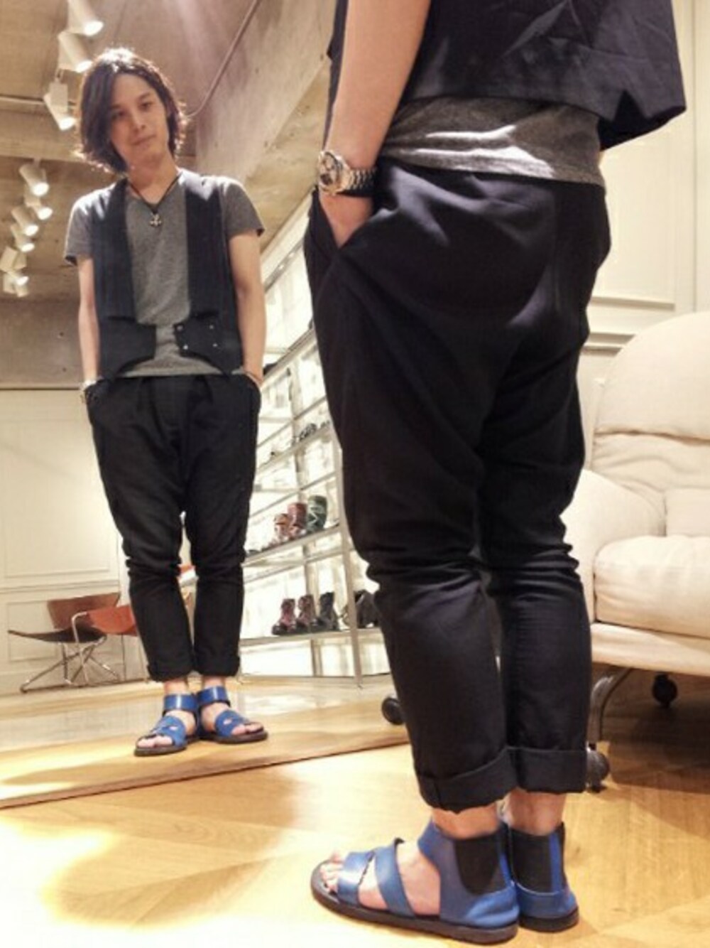 モノトーンスタイルにアクセントとして夏らしいブルーを足下にコーディネートしてみました。
