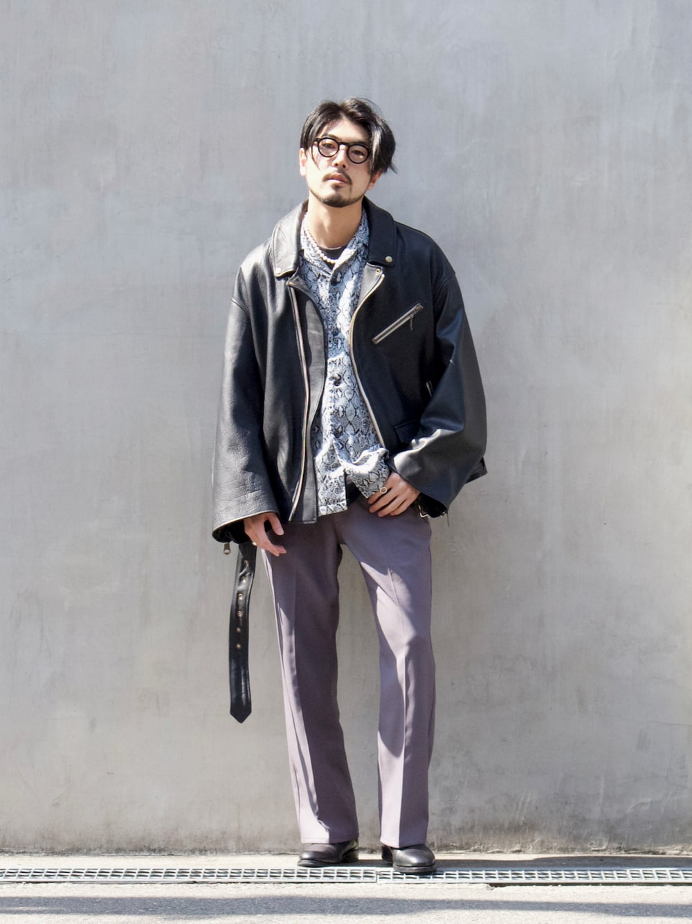 レザージャケットにフレアパンツとブーツを合わせた雰囲気コーデ Instagram @kenta_myoga