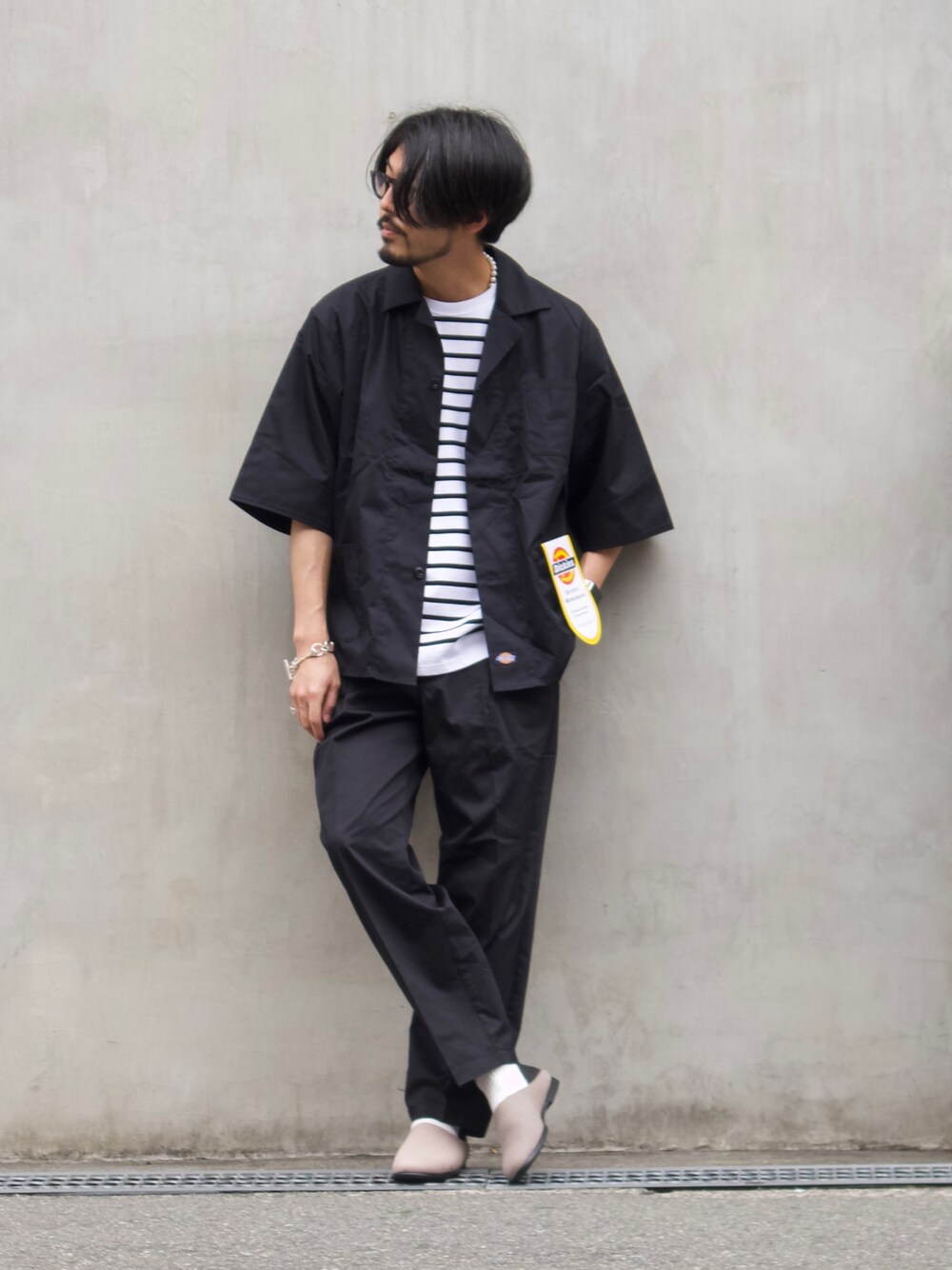 明賀健太(アルフレッド・バニスター 南堀江店)のTシャツ/カットソー「【MONTKEMMEL / モンケメル】別注 ボーダー オーバーサイズ クルーネック バスクTシャツ」を使ったコーディネート