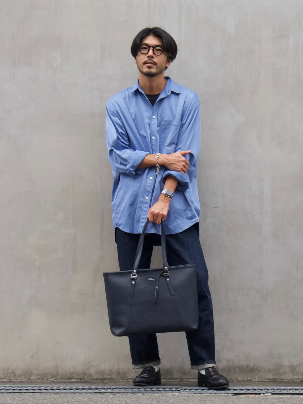 明賀健太(アルフレッド・バニスター 南堀江店)のトートバッグ「【SEEKER別注】グレイン エンボスレザートート」を使ったコーディネート