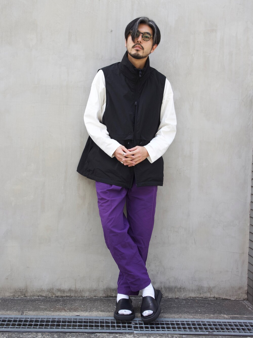 明賀健太(アルフレッド・バニスター 南堀江店)のサンダル「【WRAP SHOES】アシンメトリー ビブラムソール スライドサンダル」を使ったコーディネート