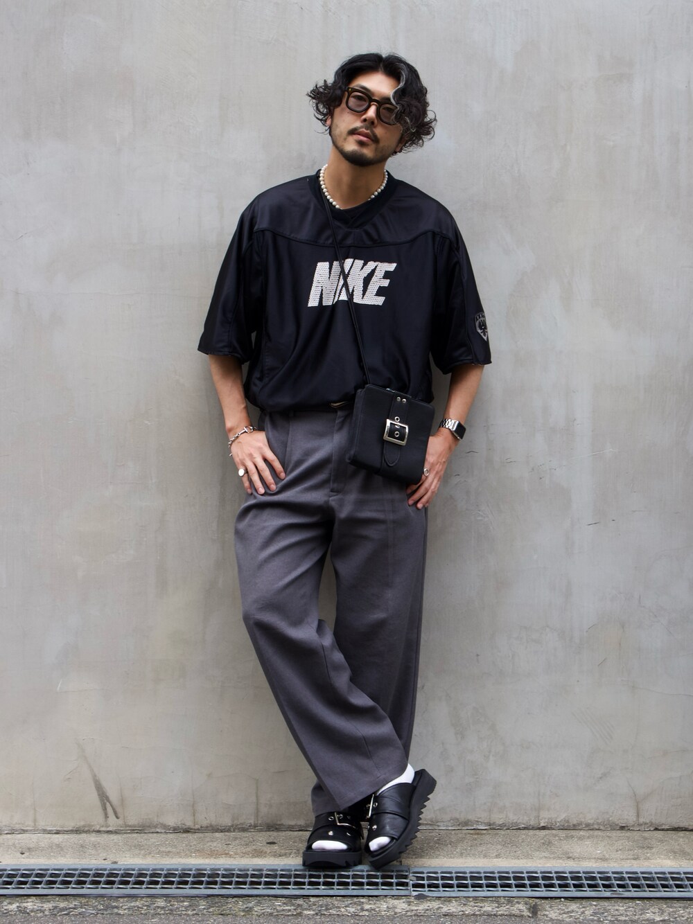 明賀健太(アルフレッド・バニスター 南堀江店)のショルダーバッグ「【WAKU別注 】ライダース スクエア ミニ ショルダーバッグ」を使ったコーディネート