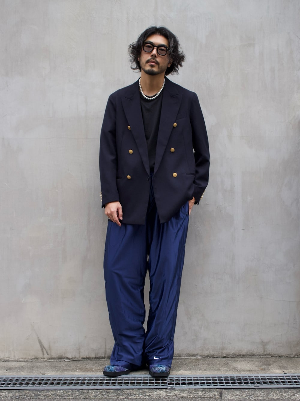 明賀健太(アルフレッド・バニスター 南堀江店)のテーラードジャケット「【40周年記念】オーバーサイズ 紺ブレザー」を使ったコーディネート