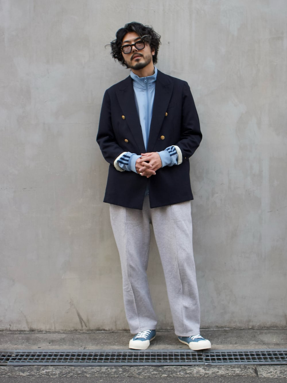明賀健太(アルフレッド・バニスター 南堀江店)のテーラードジャケット「【40周年記念】オーバーサイズ 紺ブレザー」を使ったコーディネート