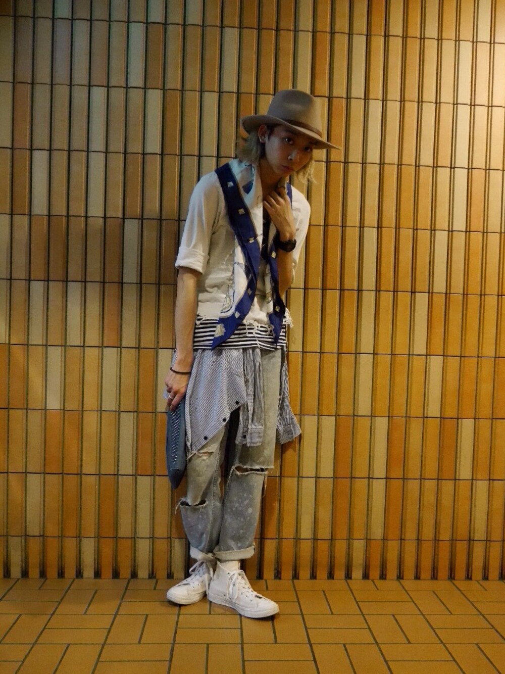 こんなにカジュアルで攻めたの久しぶりかも ダメージジーンズにボーリングシャツを腰巻 ボーダーのタンクトップにボロボロの白Tをレイヤード エルメスのスカーフ