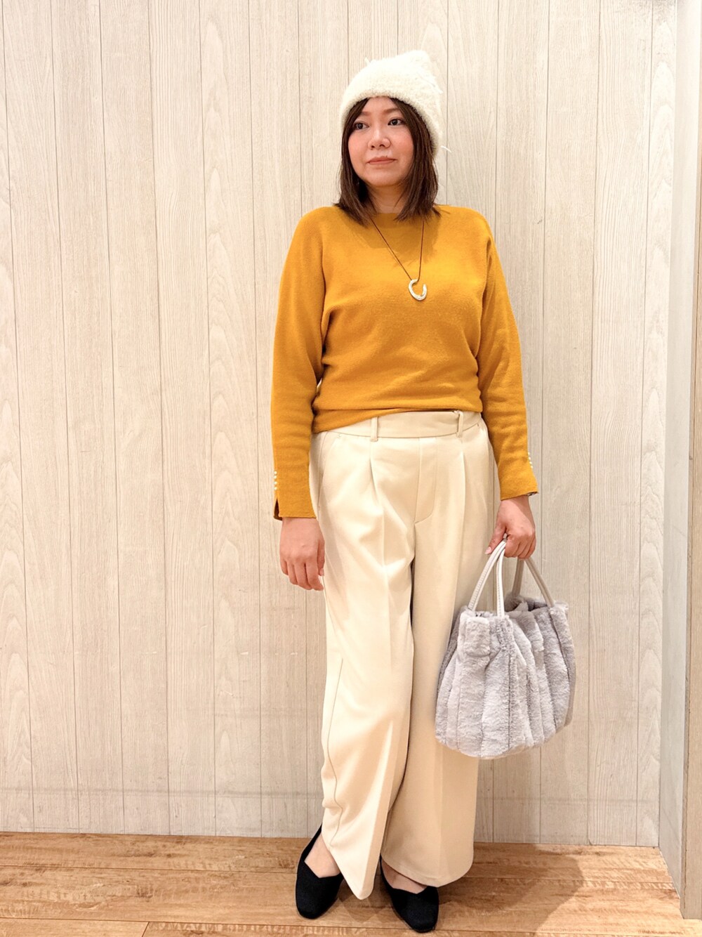 ドルマンニットとキレイめワイドパンツで体型カバーしてみました。 チクチクしにくいニットなのでただいまヘビロテ中! 暗いカラーが多くなりがちな冬も明るく過ごせるイエローで明るさを取り入れてみてはいかがでしょうか?( *´꒳`* )