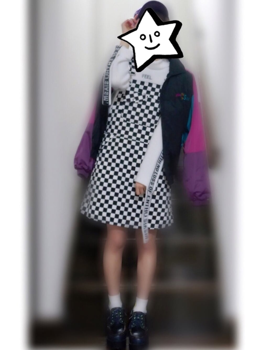 流行りのチェッカーフラッグ柄のサロペットを着用して、ボーイッシュ風にコーディネートしてみました✨ 韓国から取り寄せたシャカシャカのジャケットがお気に入りです😆