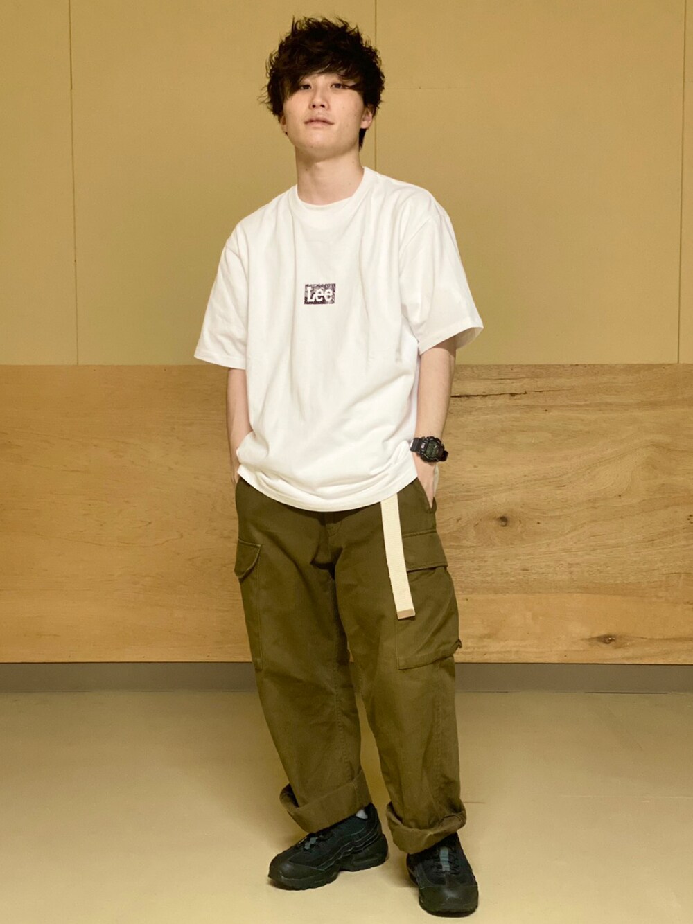 いつもいいね、お気に入りありがとうございます! 今回のテーマは 【LEEとカーゴパンツのミリタリーMIXコーデ】 こちらのLEEのTシャツはバックにある大きなプリントが特徴のアイテム!! 前は胸元のロゴのみでシンプルなデザインなので、1枚ではもちろん、羽織物などにも合わせて着ていただけます! 肩が少し落ちて身幅も少し広いのでゆったり着ていただけるシルエットとなっておりますので、今回のようにワイドシルエットのカーゴパンツと合わせていただいてもオシャレですし、デニムなどと合わせてストリートコーデもオススメです!!