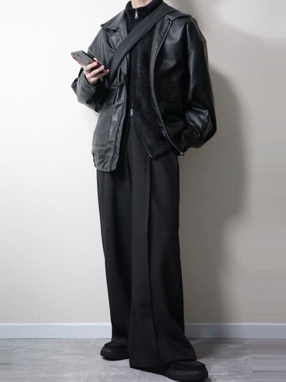 おはようございます☀️ らいです‼️ いつもいいね、フォルダインありがとうございます‼️ 今回はレザーブルゾンを使ったブラックコーデになります‼️