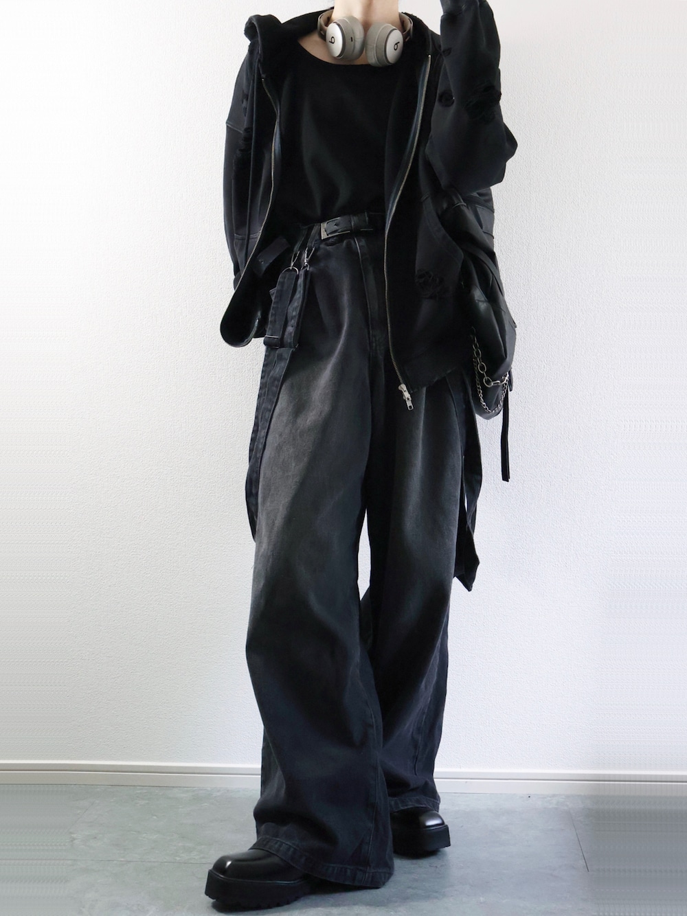 らいのデニムパンツ「【cussil/クシル】【11.5oz】ルーズシルエットダブルサスペンダーワイドパンツ」を使ったコーディネート
