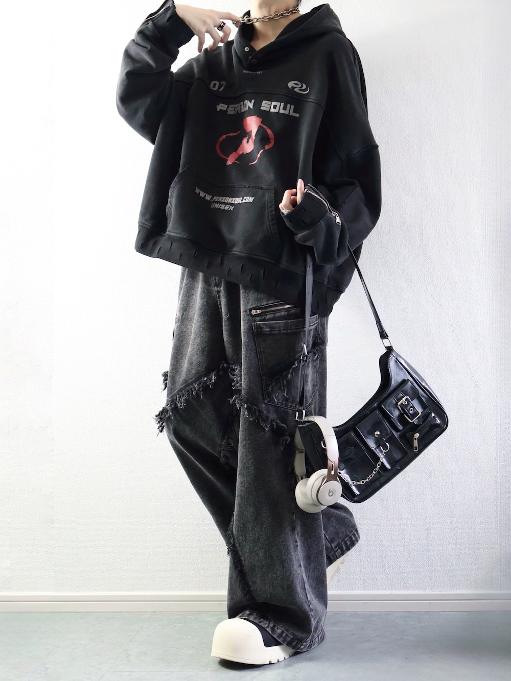 らいのショルダーバッグ「マルチポケット チェーン ベルト ショルダーバッグ y2k トート 韓国ファッション 肩掛けバッグ クロスバッグ 韓国ストリート ストリートファッション」を使ったコーディネート