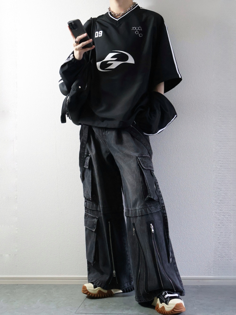 らいのデニムパンツ「【12oz】ワイドストレートメタルZIPアシンメトリーカーゴデニムパンツ」を使ったコーディネート