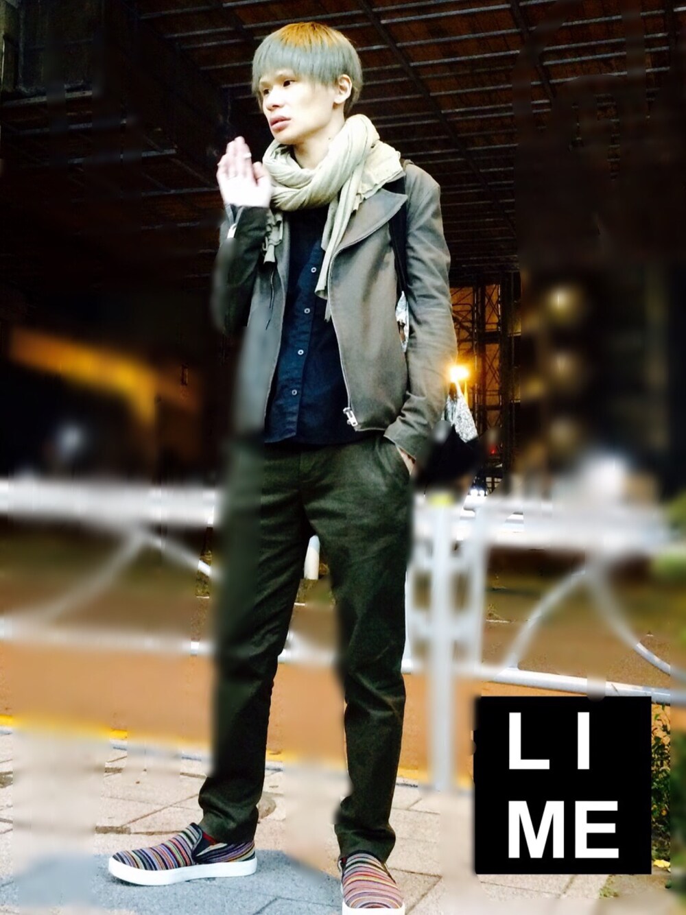 LiME(松尾 頼武)作曲家のライダースジャケット「ladのカーキのコットンライダース」を使ったコーディネート
