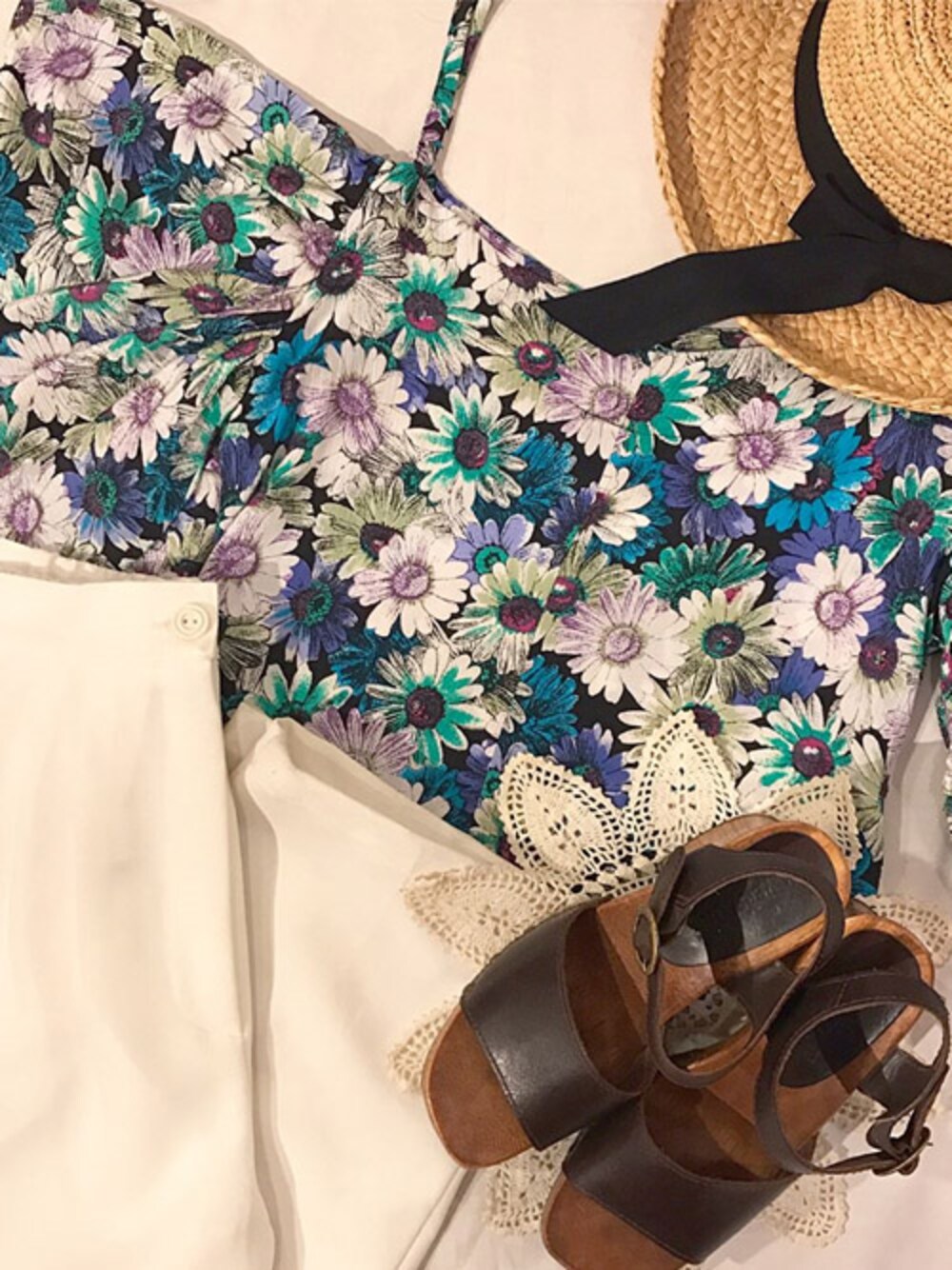 古着屋RAINBOWのキャミソール「古着 青 花柄 オフショルダー キャミソール レディース ヴィンテージ (古着屋RAINBOW) (ttu1607300)」を使ったコーディネート