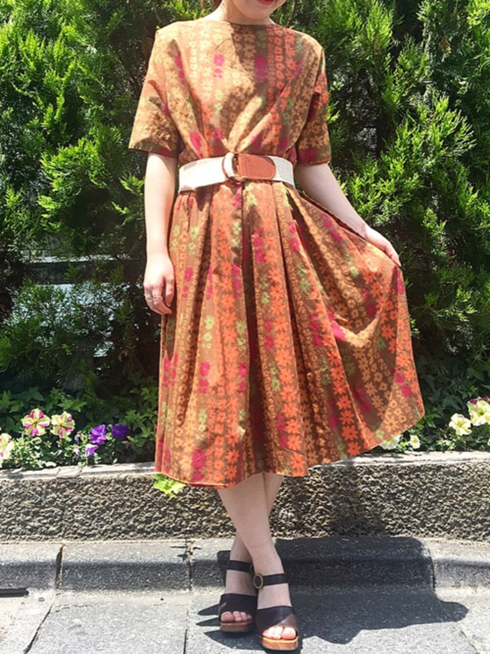 古着屋RAINBOWのワンピース「古着 茶 花柄 半袖 ロング丈 ワンピース レディース ヴィンテージ (古着屋RAINBOW) (otu1609001)」を使ったコーディネート