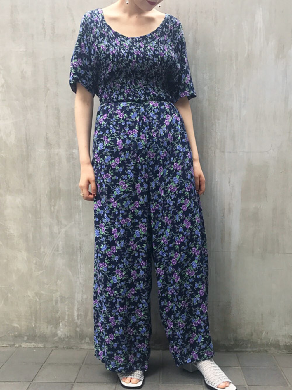 古着 紺 ネイビー 花柄 半袖 ロング丈 オールインワン ワンピース レディース ヴィンテージ (古着屋RAINBOW) (otu1704211) 9180円