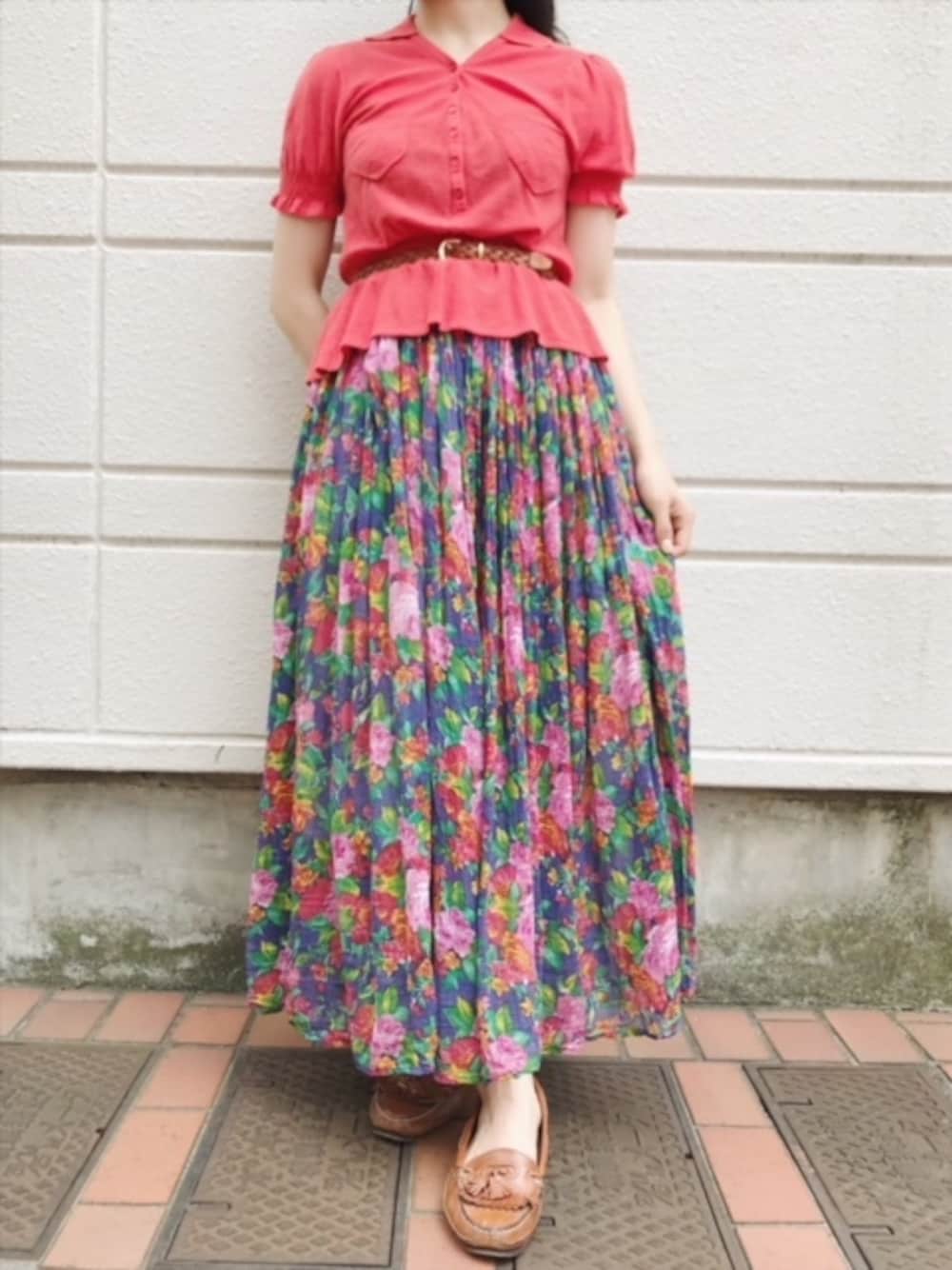 古着屋RAINBOWのスカート「古着 赤 カラフル 花柄 シフォン ロング丈 ギャザー スカート レディース ヴィンテージ (古着屋RAINBOW 通販) (btu1806034)」を使ったコーディネート