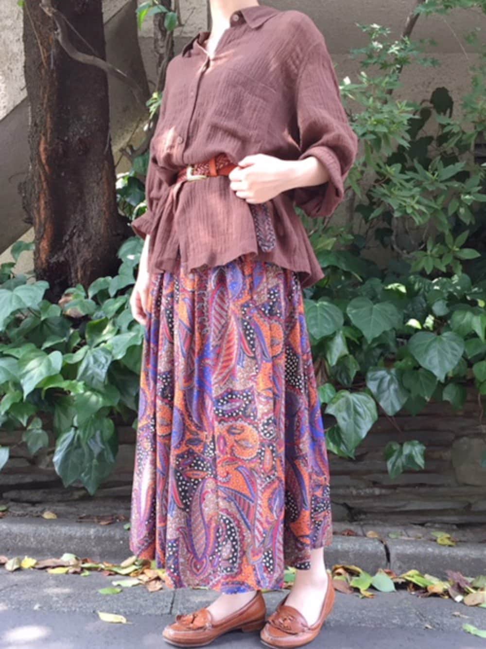 ダークカラーのペイズリー柄スカートにブラウンシャツを合わせて大人なコーディネートに仕上げました◎ ベルトをウエストにレイヤードさせてメリハリのあるスタイルに^^ -------------------------- 東京・原宿・下北沢にあるレディース古着屋RAINBOWのWEARアカウントです。 当店のバイヤースタッフが直接アメリカへ足を運び、数万点の古着商品から厳選した、 高品質のレディースヴィンテージ古着を中心に、 トータルコーディネートが出来る可愛いアイテムを取り揃えております。 また、オンラインショップでは、常時およそ1万点のレディースインポート古着を取り扱っており、 日本最大級のレディースヴィンテージ・レトロ古着の通販サイトも運営しております。 ◇OnlineShopへはこちらから ▶︎http://www.tsukuba-rainbow.com/ ”古着 RAINBOW”でも検索出来ますので是非チェックしてみてくださいね!