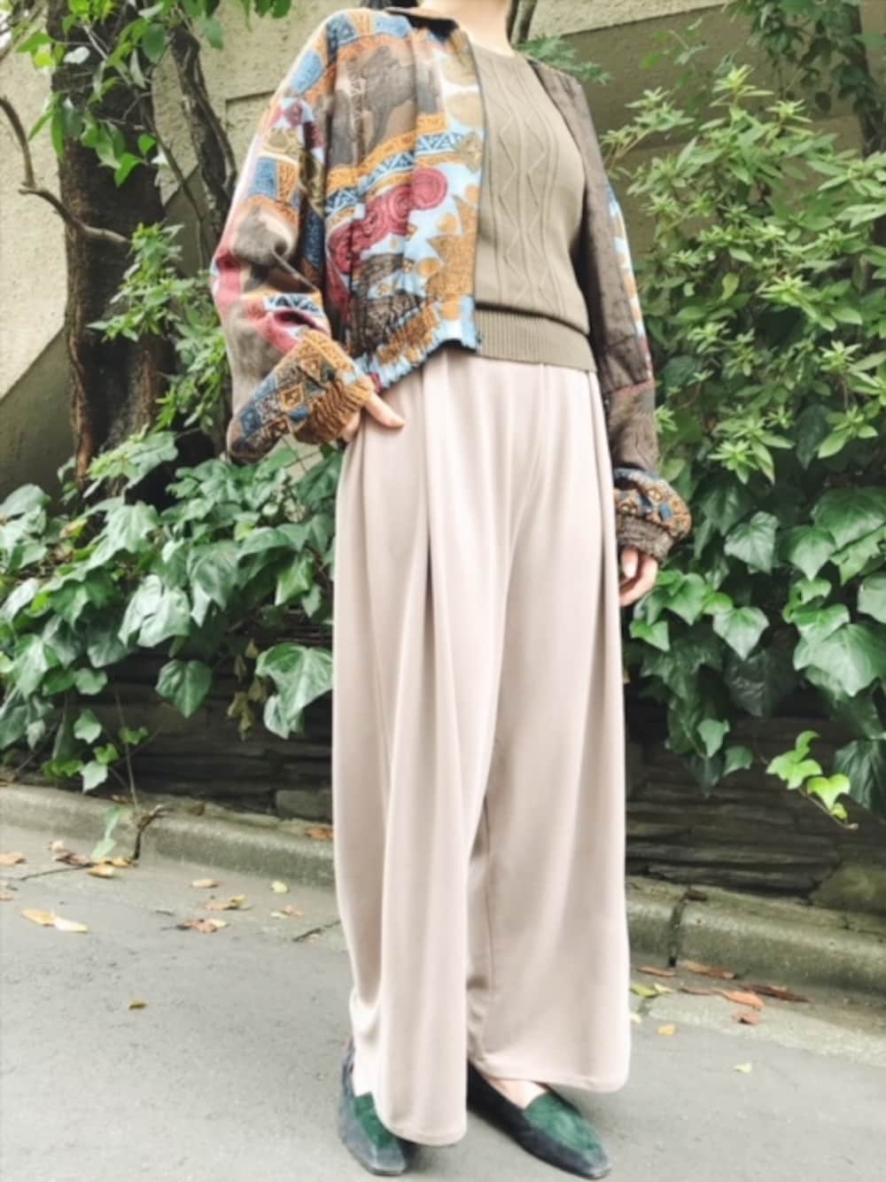 古着屋RAINBOWのブルゾン「古着 茶 カラフル ダーク 総柄 エスニック柄 ブルゾン 長袖 ライト アウター レディース ヴィンテージ (古着屋RAINBOW 通販) (ttu1808273)」を使ったコーディネート